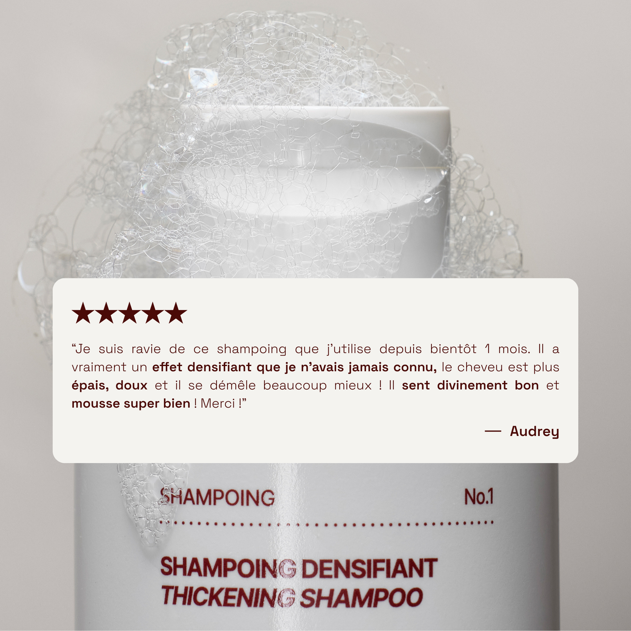 Appliquez une noisette du Shampoing Densifiant No.1 sur cheveux mouillés en massant délicatement le cuir chevelu pour un nettoyage en profondeur.